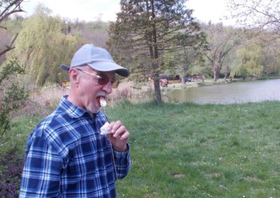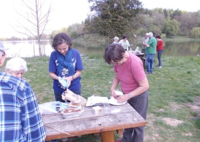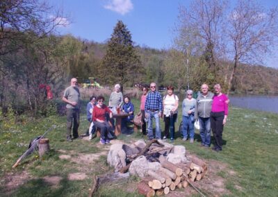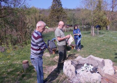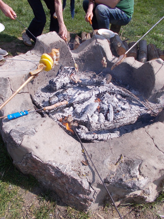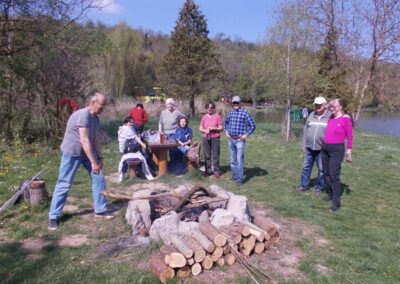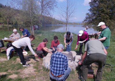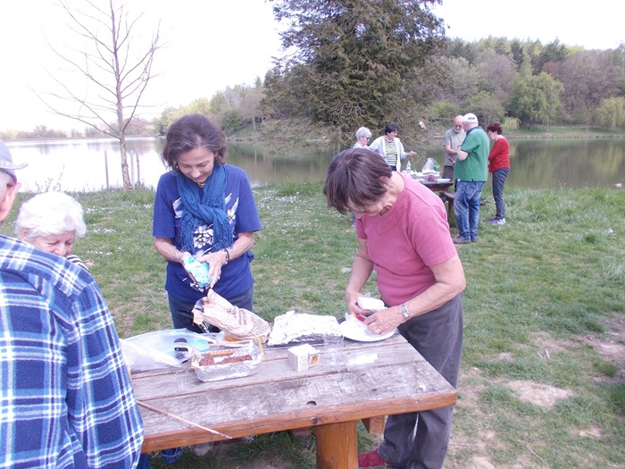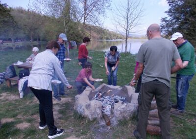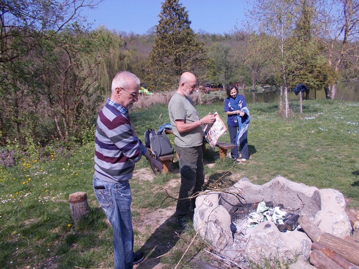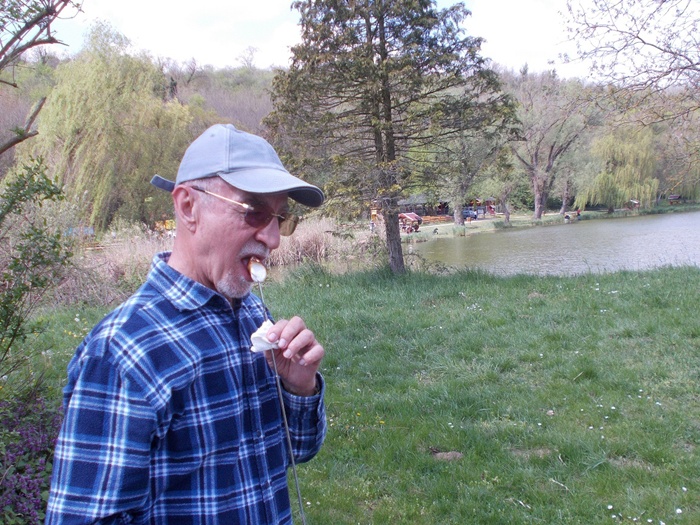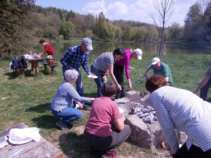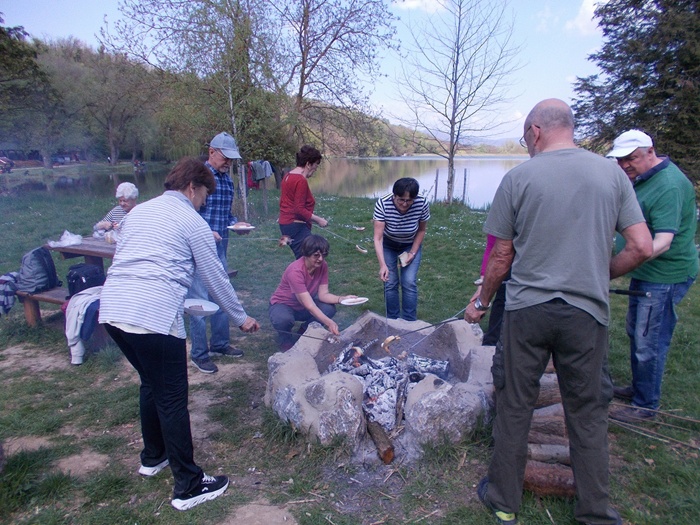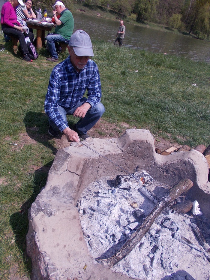 A tóparton Kocsonya Jenő klubvezető köszöntötte a résztvevőket egy kis welcome drink koccintással, majd lelkes rőzseszedésbe kezdtünk, s hamarosan fellobbant a láng. Így hát semmi akadálya nem volt, hogy ki-ki megsüthesse a magával hozott szalonnáját. A szép napos és kellemes időben a kötetlen beszélgetés Dobos Ágnes finom süteménye és Halmos Alajos ízletes borocskája mellett zajlott. Közben a parazsunk is megfelelő lett, így nekiláthattunk a nap fénypontjának, a szalonnasütésnek. Közben elbeszélgettünk a lezajlott, illetve a közelgő programjainkról.