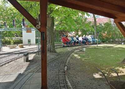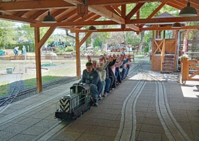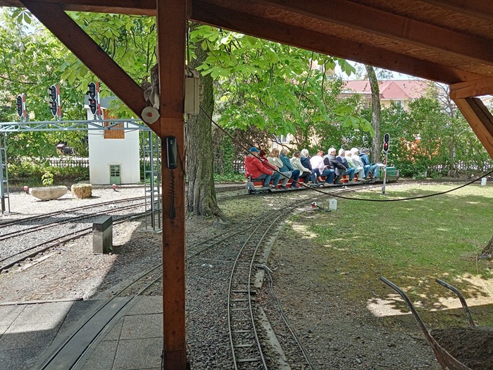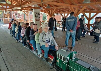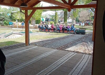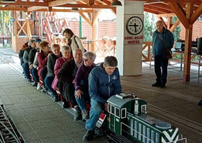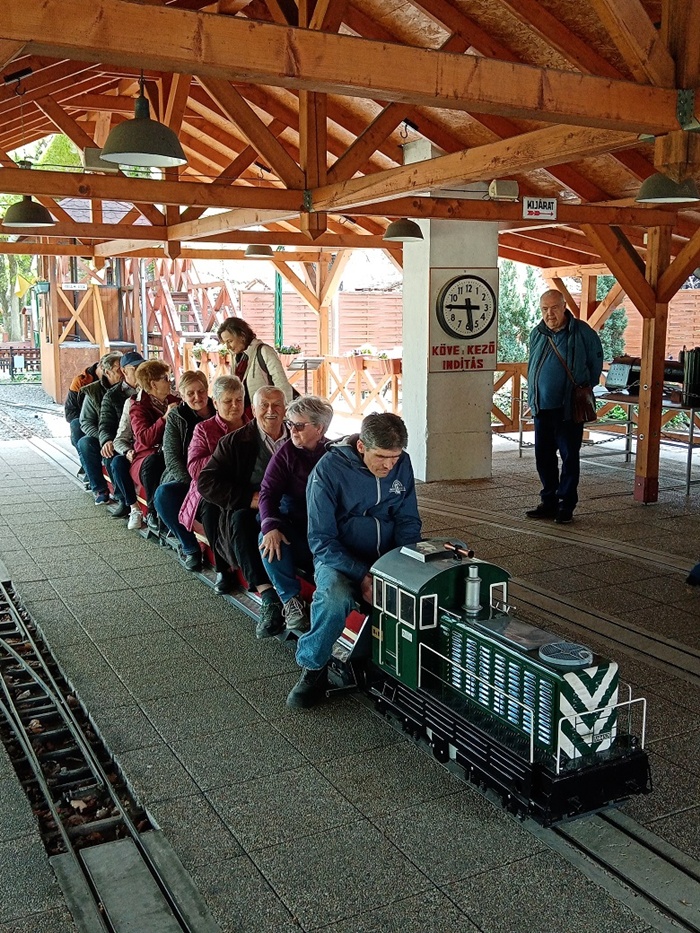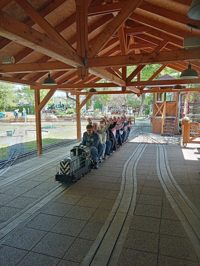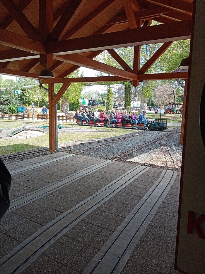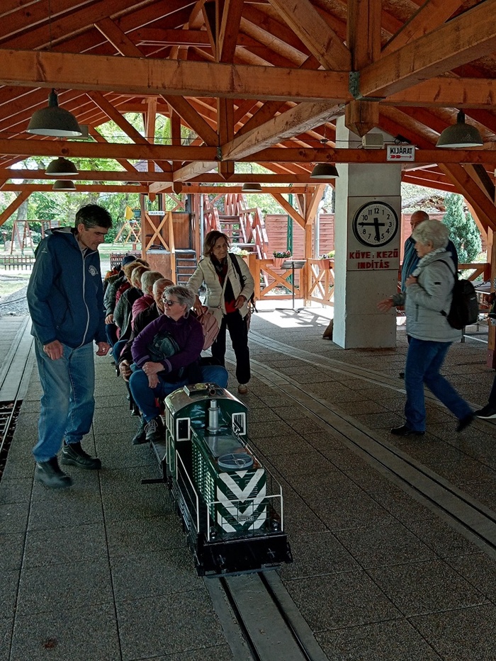 Programunk vége felé egy kis kerti vonatozáson is részt vehettünk, melyet kis csapatunk nagyon élvezett. Igaz, amikor megpillantottuk a makettvonatot erősen kételkedtünk abban, hogy ezen mi utazni is tudunk. Három fordulóban mindenki kipróbálhatta a minivonatozást a park területén. Olyan helyeket is bejártunk, ahová gyalogosan nem jutottunk el. Átkeltünk egy kis tavon, egy alagúton, és láthattuk a „Borkóstoló feltételes megállóhelyet” is.