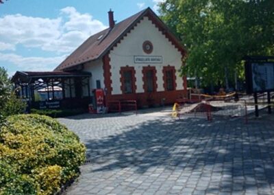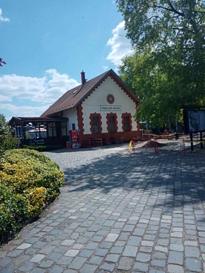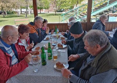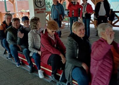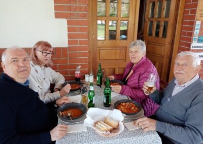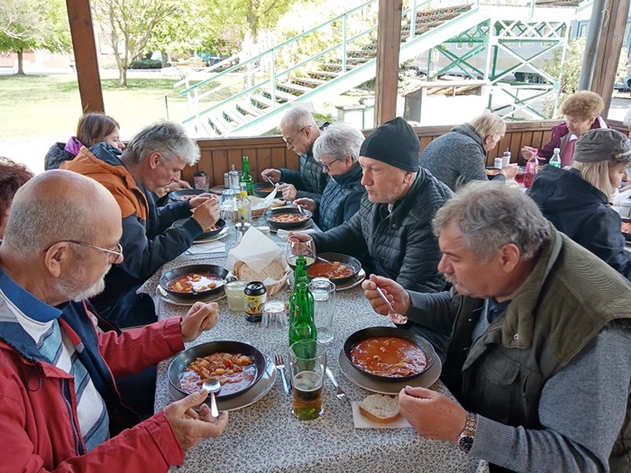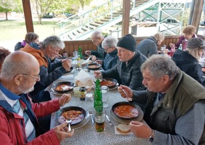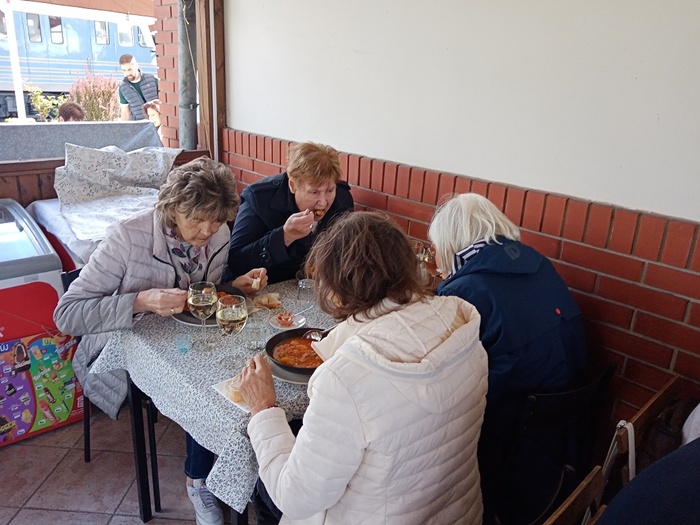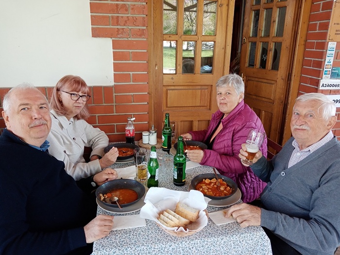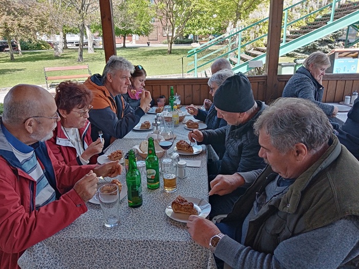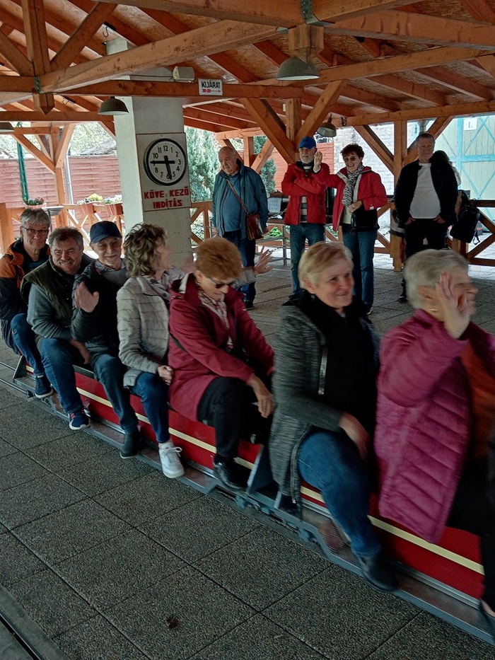 A mesés utazás után programunk zárásaként betértünk a park területrén működő „Utasellátó Kávézóba”, ahol elfogyasztottuk az előre megrendelt kiadós gulyáslevest és almás pitét. Az ebédet ki-ki ízlése szerint választott nedűvel – sörrel, borral vagy bambival – öblíthette le. Bár a szépen megterített asztaloknál kicsit hűvös volt, de utána annál jobban élveztük a délutáni kellemes napsütést.