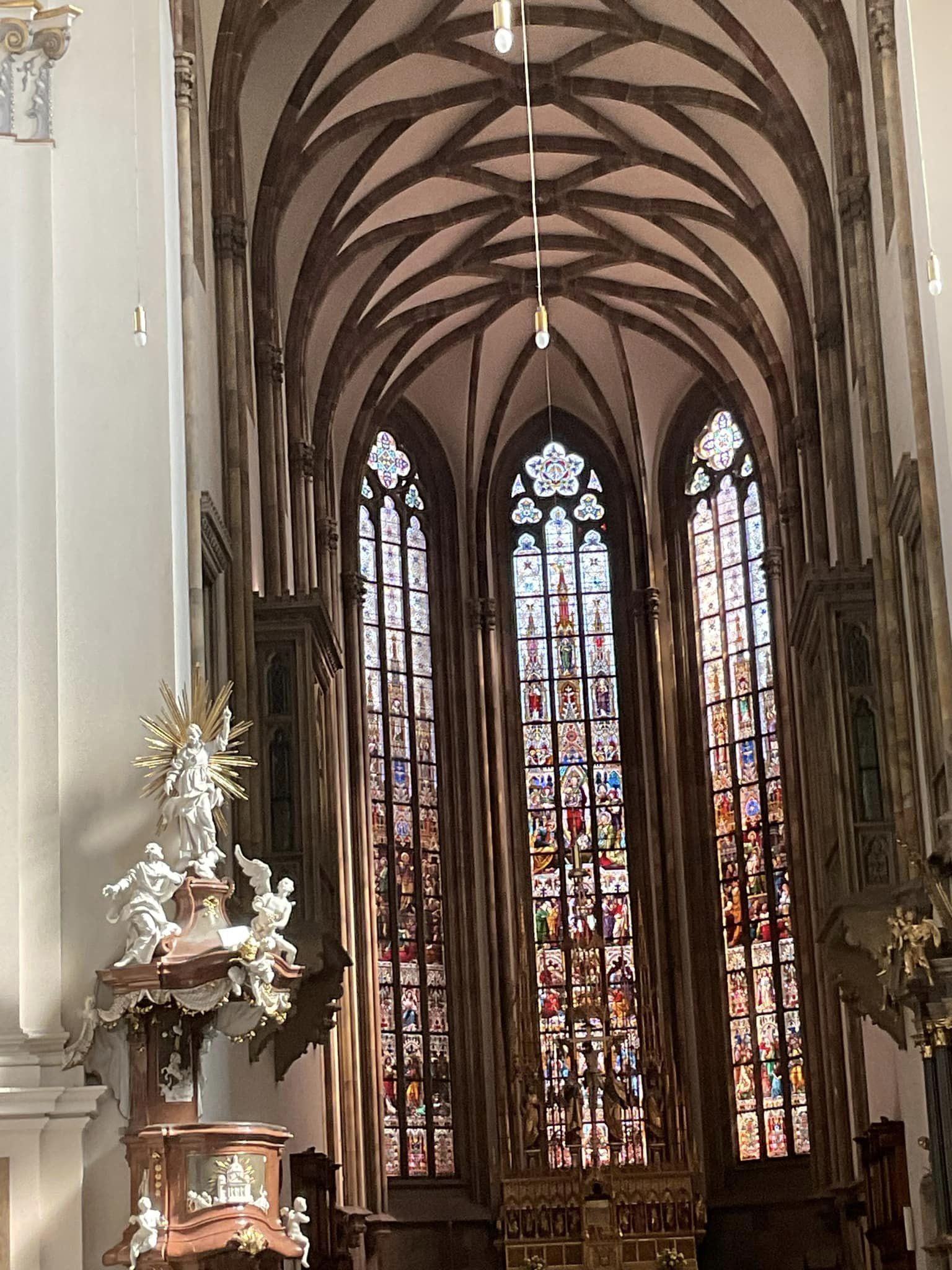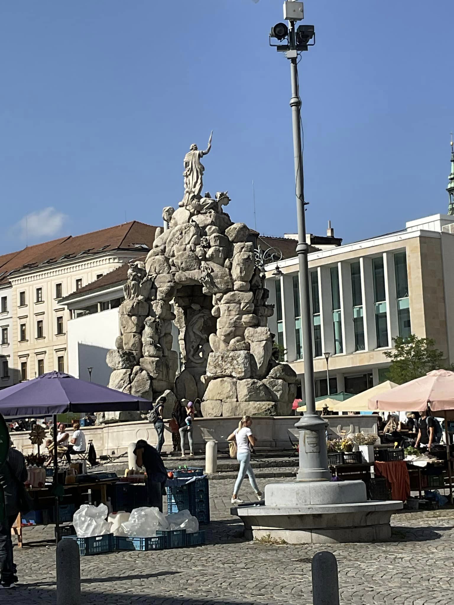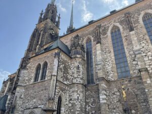 Számomra legemlékezetesebb a könyvtár csigalépcsője, melyet egyetlen tölgyfából faragták ki. A folyosókat, a mennyezeteket csodaszép faburkolatok borítják. Rövid sétát tettünk a kastélyt körülvevő angol és francia parkban. 12.30-kor már megérkeztünk Brno-ba. Megtekintettük a belváros nevezetességeit: a Petrov dombon emelkedő Szent Péter-Pál katedrálist, az Óváros házát és a Zöldség piacot.