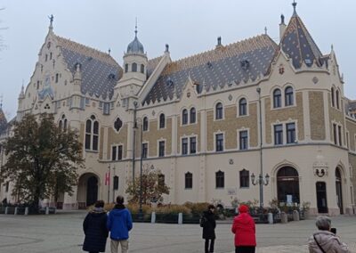 Első utunk a hírős Kecskemétre vezetett, a Lechner Ödön és Pártos Gyula tervei alapján, szecessziós stílusban épített „tündérpalotába”, azaz a Városháza dísztermébe. A tárlatvezető elmondta, hogy nemcsak a közgyűlés üléseinek hazai és nemzetközi konferenciáknak biztosít helyszínt, hanem ünnepélyes fogadásoknak és esküvőknek is. A 90-es években II. Erzsébet királynőt is fogadták a teremben. Megcsodáltuk Székely Bertalan falfestményeit, melyek a magyar történelem egy-egy szakaszait mutatja be, többek között a vérszerződést is, valamint a magyartörténelemben jelentős szerepez játszó királyok, hadvezérek, politikusok domborműves arcképeit. A terem berendezései kézművesipari munkával készültek. A homlokzat közepén helyezték el a harangjátékot, amely napközben minden órában Kodály Zoltán szvítjét, valamint a „Kecskemét is kiállítja…” kezdetű népdalt játssza el, melyet sikerült is meghallgatnunk.